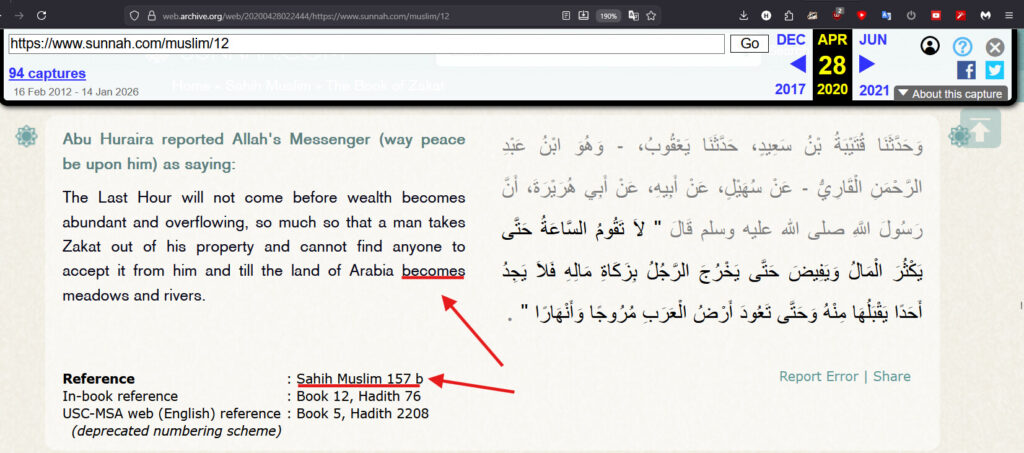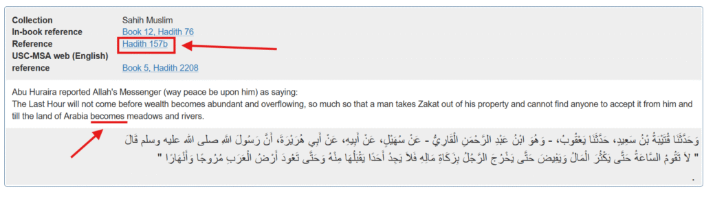 - Wayback Machine captures Sunnah.com displaying Sahih Muslim 157b with Abdul Hamid Siddiqui’s translation: “the land of Arabia BECOMES meadows and rivers“