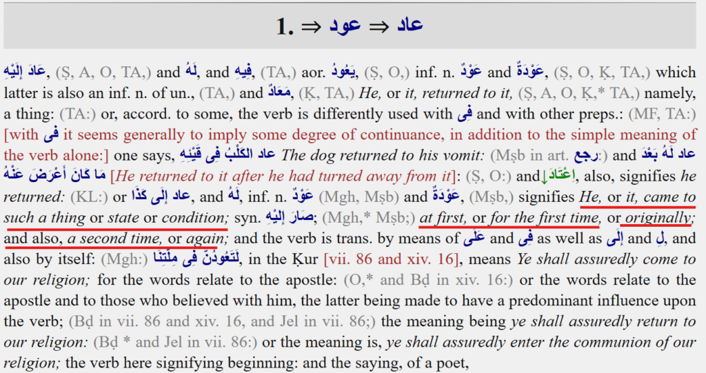 Unlike the Quran, hadith were never transmitted word-for-word. Muslim scholars have always acknowledged this. It’s called narration by meaning (riwaya bil ma’na). Jonathan Brown explains that Muslim scholars allowed hadith to be paraphrased as long as the narrator understood the meaning. Imam Nawawi wrote that the majority of early scholars agreed it was permissible to narrate hadith in your own words. What does this mean? Even if this hadith did originate with Muhammad (which the evidence strongly suggests it didn’t), we cannot be certain he used the exact word تعود. The narrator might have summarized using his own vocabulary. The precise wording is unknowable.