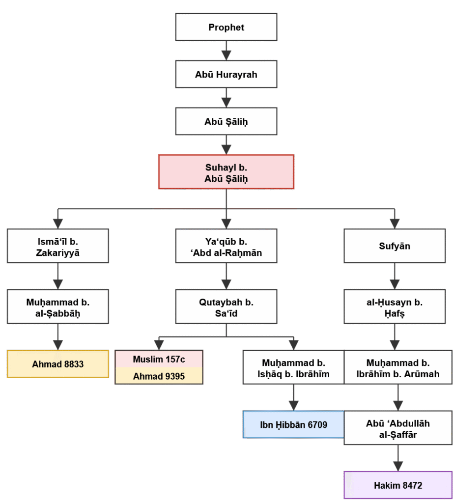 - Al-Ḥākim 8472: Transmitted through a different early chain (al-Ḥusayn ibn Ḥafṣ ← Sufyān ← Suhayl), notable because Sufyān explicitly expresses uncertainty about whether the hadith is actually marfūʿ (raised to the Prophet).