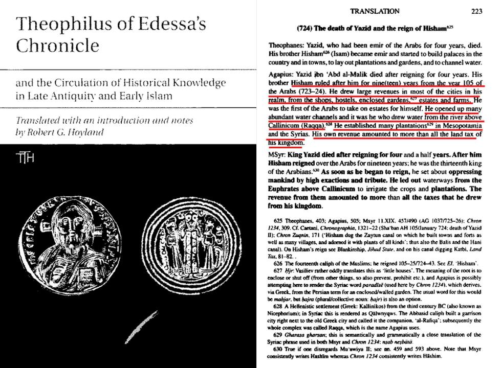 The reign of Hishām ibn ʿAbd al-Malik (r. 724–743 CE) marked the height of Umayyad state intervention in land reclamation and irrigation. Archaeological and historical sources show a deliberate effort to ‘green’ large tracts of the caliphate’s territory, linking agricultural revival to divine favor and political legitimacy. Marsham notes that under Hishām, the caliph “…opened up many abundant water channels and it was he who drew water from the river above Callinicum (Raqqa). He established many plantations in Mesopotamia and the Syrias.” This was his attempt in forming part of a broader policy in reclaiming uncultivated land and expanding the tax base. These initiatives required significant public investment and in the Ḥijāz, this often came at the expense of local ownership: “The Hijaz’s local elites did not only have to put up with competition from the Umayyads for expanding cultivable land; they also had to bear seeing their estates confiscated, bought up as distress sales, or otherwise infringed upon by members of the Umayyad family.”