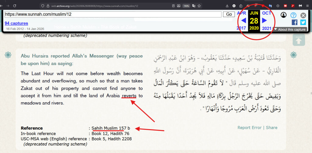 - Wayback Machine captures Sunnah.com displaying: “the land of Arabia REVERTS to meadows and rivers“
